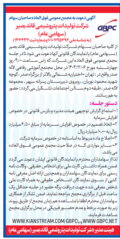 از کلیه سهامداران ، وکیل یا قائم مقام قانونی صاحب سهم و همچنین نماینده یا نمایندگان اشخاص حقوقی دعوت میگردد تا در جلسه مجمع عمومی این شرکت که در ساعت 09:00 روز چهار شنبه مورخ 1404/12/06 در استان تهران ،شهر تهران به آدرس اختياريه شــمالي بالاتر از بزرگراه صدر، کوچه شهيد محمود نوريان، روبروي دبيرســتان پسرانه سپهر، مجموعه لاله صدر، طبقه دوم ســالن اجتماعات برگزار میگردد حضور بهم رسانند.